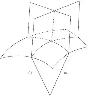 A biological membrane is commonly described as a two-dimensional surface, which spans a three-dimensional space. So, to describe membrane shape, it is not sufficient to determine the membrane curling that is seen in a single cross-section of the object, because in general there are two curvatures that characterize the shape each point in space. Mathematically, these two curvatures are called the principal curvatures, and , and their meaning can be understood by the following thought experiment. If you cross-section the membrane surface at a point under consideration using two planes that are perpendicular to the surface and oriented in two special directions called the principal directions, the principal curvatures are the curvatures of the two lines of intercepts between the planes and the surface which have almost circular shapes in close proximity to the point under consideration. The radii of these two circular fragments, and , are called the principal radii of curvature, and their inverse values are referred to as the two principal curvatures.[3]