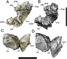 A partial premaxilla, postorbital, squamosal, quadrates, skull roof, braincase, partial dorsal vertebrae, dorsal rib, ossified tendons, scapula, proximal end of a humerus, ulna lacking the proximal end, radius lacking the proximal end, metacarpals, and incomplete pubis and ischium.[1] |
