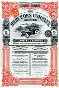 (Right): Share of the Mercedes Company Limited, issued 23 June 1904; this British sales company was the first company which was allowed to sell Mercedes cars in England and in other countries. It was also allowed to have "Mercedes" in its name