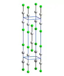 Unit cell of Hg2F2, with F from adjacent molecules coordinating the Hg atoms