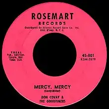 Rosemart Records released "Mercy, Mercy", with the artist name "Don Covay and the Goodtimers", as a single by in August 1964.[9] Producer Abramson's former label Atlantic picked up the distribution and it entered the Billboard Hot 100 on September 5, 1964.[9] The single reached number 35 during a stay of ten weeks on the chart.[9] It was also a best seller in the R&B market, reaching number one on the Cash Box R&B chart (Billboard's R&B chart was suspended at the time).[10]