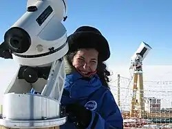 Chadid became the first Moroccan as well as the first female French astronomer to reach the heart of Antarctica, and the first to plant an Arab and an African flag (the Moroccan flag) in Antarctica[8][7] in 2005 when she achieved her first polar expedition to set up a new observatory.[5] Of her many achievements, her most treasured accomplishment has been her work under extreme conditions in the heart of Antarctica, one of the highest, coldest, most deserted and inaccessible places in the world. She is considered the world's first astronomer to be committed to installing the large astronomical observatory in Antarctica, where she has carried out pioneering work. In interviews, she has compared the installation of the observatory to a space mission, an area characterized by only a thin layer of turbulence, making it easier to observe faraway objects than observatories in other parts of the world. As night continues for several months of the year, researchers at the Antarctica stations have the advantage of being able to study the stars 24/7.[7]