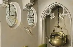 It shows the moment before the traditional Annunciation scene, when Mary is still unaware of the presence of Gabriel.[13] She is in a red gown rather than the more usual blue, and in a relaxed pose, reading from a book of hours, with her hair unbound. Unusually for a medieval depiction of the Annunciation, the dove of the Holy Spirit is not visible. Instead he is represented by the extinguished light of the candle, and the beam of light falling from the window to the left, which carries the Christ Child holding a cross.[14] The Christ Child flies down towards Mary from the left oculus, signifying her impregnation by God the Father. He gazes directly at her and holds a cross. The folding-table contains a recently extinguished candle,[15] and shows coiling smoke and a still glowing wick. This maybe a reference to the Holy Spirit, who, according to some late medieval writers, descended to the apostles "like a puff of wind".[16]