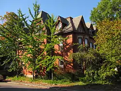 The Merrill Double House is an historic two family house at 18-20 West Street in Worcester, Massachusetts. The 2+1⁄2-story Victorian Gothic Revival brick building was built c. 1879, apparently by the heirs of a local shopowner, Enoch Merrill, whose house had previously stood on the lot. The two units are symmetrically laid out on either side of a common party wall. The center of the main facade includes a porch that shelters the paired entrances, and each side facade includes a pavilion that rises a full three stories with a steeply pitched roof.[2]