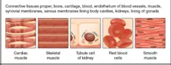 Some of the mesoderm derivatives include the muscle (smooth, cardiac, and skeletal), the muscles of the tongue (occipital somites), the pharyngeal arches muscle (muscles of mastication, muscles of facial expressions), connective tissue, the dermis and subcutaneous layer of the skin, bone and cartilage, dura mater, the endothelium of blood vessels, red blood cells, white blood cells, microglia, the dentin of teeth, the kidneys, and the adrenal cortex.[5]