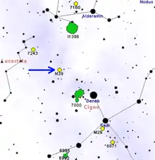 Messier 39 or M39, also known as NGC 7092, is an open cluster of stars in the constellation of Cygnus, positioned two degrees to the south of the star Pi Cygni[7] and around 9° east-northeast of Deneb.[8] The cluster was discovered by Guillaume Le Gentil in 1749, then Charles Messier added it to his catalogue in 1764.[7][9] When observed in a small telescope at low power the cluster shows around two dozen members[7] but is best observed with binoculars.[7] It has a total integrated magnitude (brightness) of 5.5 and spans an angular diameter of 29 arcminutes[4] about the size of the full Moon.[8] It is centered about 1,010 light-years (311 parsecs) away.[2]