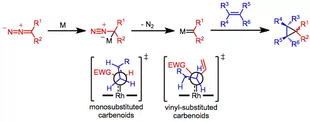 Metal-catalyzed cyclopropanations are chemical reactions that result in the formation of a cyclopropane ring from a metal carbenoid species and an alkene.[1] In the Simmons–Smith reaction the metal involved is zinc. Metal carbenoid species can be generated through the reaction of a diazo compound with a transition metal). The intramolecular variant of this reaction was first reported in 1961.[2] Rhodium carboxylate complexes, such as dirhodium tetraacetate, are common catalysts. Enantioselective cyclopropanations have been developed.[3]
