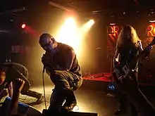 During the 1980s, several thrash metal bands formed a prototype for black metal. This so-called "first wave" included bands such as Venom, Bathory, Mercyful Fate, Hellhammer and Celtic Frost.[30] A "second wave" arose in the early 1990s, spearheaded by Norwegian bands such as Mayhem, Burzum, Darkthrone, Immortal, and Emperor. The music of the early Norwegian black metal scene became a distinct genre. Initially considered a synonym for "Satanic metal", black metal has often been met with hostility from mainstream culture, mainly due to the misanthropic and anti-Christian standpoint of many artists. Moreover, several of the genre's pioneers have been linked with church burnings and murder. Some have also been linked to neo-Nazism; however, most black metal fans and most prominent black metal musicians reject Nazi ideology and oppose its influence on the black metal subculture.[31][32][33]