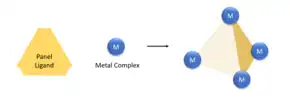 Here, rigid ligands act as 'panels' and coordination complexes join them together to create the shape.[4][8] In the figure at left, the yellow triangles represent panel ligands, and the blue dots are metal complexes. The ligands of the complex itself helps enforce the final geometry.