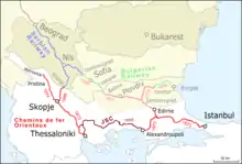 In 1895, The Swiss Bank für Orientalische Eisenbahnen purchased 30000 stocks out of 100000 issued, giving it a minority shareholding.[7] Bank für Orientalische Eisenbahnen was also the owner of the Chemins de fer Orientaux and of the Salonica Monastir Railway. The main objective of the Chemins de fer Orientaux was to secure an alternate route between Serbia and Istanbul through Greece should the main route through Bulgaria be closed by the Bulgarian government. After the end of Balkan Wars in 1913, the line ended fully in Greek territory. The Greek government purchased the JSC in 1920,[8] and the railway became part of the Hellenic State Railways.