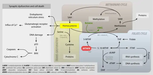 - ↑ Hua Y, Zhao H, Kong Y, Ye M (August 2011). "Association between the MTHFR gene and Alzheimer's disease: a meta-analysis". The International Journal of Neuroscience. 121 (8): 462–71. doi:10.3109/00207454.2011.578778. PMID 21663380. S2CID 835012.