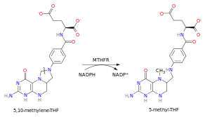 Methylenetetrahydrofolatereductase (MTHFR) is the rate-limiting enzyme in the methyl cycle, and it is encoded by the MTHFR gene.[5] Methylenetetrahydrofolate reductase catalyzes the conversion of 5,10-methylenetetrahydrofolate to 5-methyltetrahydrofolate, a cosubstrate for homocysteine remethylation to methionine. Natural variation in this gene is common in otherwise healthy people. Although some variants have been reported to influence susceptibility to occlusive vascular disease, neural tube defects, Alzheimer's disease and other forms of dementia, colon cancer, and acute leukemia, findings from small early studies have not been reproduced. Some mutations in this gene are associated with methylenetetrahydrofolate reductase deficiency.[6][7][8] Complex I deficiency with recessive spastic paraparesis has also been linked to MTHFR variants. In addition, the aberrant promoter hypermethylation of this gene is associated with male infertility and recurrent spontaneous abortion.[9][10]