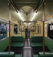A single prototype car designated C20F stock is in use. Built on Bombardier Transportation's FICAS technology,[18] it has a lighter body, much thinner side walls, and more space compared to the regular C20, by using a sandwich-like composite construction of the body. It also has air-conditioning for passenger area, whereas standard C20 has air-conditioning only for the driver's cab. However only the last 70 C20 units produced (2200-2270) are equipped with air conditioning in the drivers cab. All other C20 units completely lack air conditioning. Therefore units lacking air conditioning are usually placed in the middle of trains and moved to the blue line during the summer, where the air conditioning is the least needed. The C20F weighs 65 tonnes (64 long tons; 72 short tons), other exterior measurements are the same as for the C20. The C20F has the same number of seats as the C20, but has space for 323 standing passengers.[17]