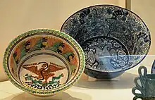 Handcrafts in Mexico vary widely from materials used, techniques and employ and styles preferred.[3] The most prevalent of Mexico's crafts is ceramics/pottery. Ceramics was considered one of the highest art forms during the Aztec Empire, with the knowledge of making pottery said to have come from the god Quetzalcoatl himself. Pre-Hispanic pottery was made by coiling the clay into a circle then up the sides, then scraping and molding the coiled work until the coils could no longer be detected. The Spanish introduced the potters’ wheel and new glazing techniques.[28] Majolica glazed pottery was introduced by the Spanish. Puebla in particular is renowned for its variety of Majolica, which is called Talavera. One distinctive feature of this city is that many kitchens and buildings are decorated with intricately detailed Talavera tiles.[29] Tiles are a subset of ceramic pottery and were used extensively in colonial-era Mexico. These tiles were first fired at a low temperature, then hand-painted with intricate designs, then fired at a high temperature to set the glaze. These are still made, but most decorative tiles used in Mexico are factory-made.[30] Unglazed pottery is still made, but generally it is for decorative purposes only, and copies the designs of pre-Hispanic cultures.[29]