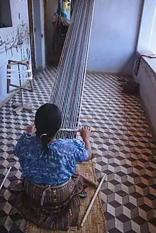 Many different fibers are twisted, knotted and woven into textiles and objects. Materials include rushes, reeds, thread, plastic string and rope as well as many more. Historically, fibers were dyed using pigments created from plants and animals. Synthetic dyes have replaced natural ones for many craftspeople, but there still are some, especially in Oaxaca state that still use traditional dyes.[34] Woven materials in Mexico started with basketry and mat-making. The agave plant was an important source of fibers and thread and is still used to day for thread and paper. Cotton was also used, spun into thread by itself or combined with feathers or animal fur to provide warmth. Very traditional Mexican women still spin their own thread, which are made from cotton or wool and can be very fine or very coarse.[35] Textiles have long history of tradition. Brightly colored embroidered designs on female garments can identify tribe, age, and marital status of the wearer. Woven textiles were known to pre-Hispanic cultures for hundreds of years before the arrival of the Spanish, using a back-strap loom fastened between a tree and the weaver's back. The Spanish introduced the treadle loom, which can make larger pieces of cloth.[22]