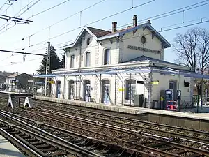Meximieux—Pérouges station (French: Gare de Meximieux—Pérouges) is a railway station located in the commune of Meximieux, Ain department in the Auvergne-Rhône-Alpes region of France. As its name suggests the station is located within proximity of, and serves the nearby medieval era commune of Pérouges. It is located at kilometric point (KP) 38.393 on the Lyon–Geneva railway, between the stations of La Valbonne and Ambérieu-en-Bugey.