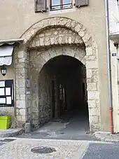 The Camin Ferrat is the path connecting the Gévaudan and Causse Méjean with the famous abbey of Gellone at Saint-Guilhem–du-désert in Languedoc. It enters the city by the southern gate (the Pied de Ville) after the bridge over the Jonte (le Pont Vieux), and crosses the city. The tomb of Saint Guilhem and the supposed relics of the "Holy Cross" attract crowds. On this path in the early 11th century, the barons of Meyrueis erect a small priory of roman style dedicated to St. Peter (c. 1034?).[5] In 1042, the monks of the Benedictine Abbey of Gellone receive the priory as the gift from Bermont de Sauve and his brother Almérade d'Anduze.[6] In 1058, it was the turn of the powerful monastery of St. Victor of Marseilles to settle in the valley with the acquisition of Saint-Martin-des-Ayres (1 km east of the city). In the 12th century, the hospital of the Order of St. John of Jerusalem (Knights of Malta today) found an hospital and a church dedicated to St. John. Owners of large estates on the Causse Noir, they also create a mill in the city and a house for the commander.