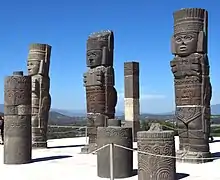 The modern archaeological site consists of the ceremonial center of Tula Grande, an area called Tula Chico, the Jorge R. Acosta site museum, and the Guadalupe Mastache orientation center.[31] The ceremonial center of the city is located on a limestone outcropping, with steep banks on three sides, making it defensible.[32] War and sacrifice are prominent themes at the site, with images representing warriors such as jaguars and coyotes, as well as eagles eating human hearts. There are also images of serpents eating skeletal figures and skulls in various areas.[30][32] The major attraction of the site is Pyramid B, also called the Pyramid of Quetzalcoatl or of the Morning Star. It is a five-tiered structure similar to the Temple of the Warriors at Chichen Itza. At the top of Pyramid B are four massive columns, each carved in the likeness of Toltec warriors which once supported the roof of the temple on top of the pyramid. Each warrior figure is of basalt, 4 metres (13 ft) high, with an atlatl or spear thrower, incense, a butterfly-shaped chest plate, and a back plate in the shape of a solar disk.[32]