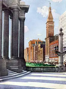 This plan was further elaborated upon in Daniel Burnham's 1909 Plan of Chicago,[9] and in 1911 a plan was selected that included the widening of Michigan Avenue from Randolph Street to the river, replacing the Rush Street bridge with a new bridge at Michigan Avenue and the construction of a double-decked boulevard along Pine Street as far as Ohio Street.[10] When the Michigan Avenue Bridge was completed, Pine Street was renamed Michigan Avenue. At its north end it merges into Lake Shore Drive near the Drake Hotel.