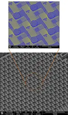 There are several methods to manufacture microLED displays. The flip-chip method manufactures the LED on a conventional sapphire substrate, while the transistor array and solder bumps are deposited on silicon wafers using conventional manufacturing and metallization processes. Mass transfer is used to pick and place several thousand LEDs from one wafer to another at the same time, and the LEDs are bonded to the silicon substrate using reflow ovens. The flip-chip method is used for micro displays used on virtual reality headsets. The drawbacks include cost, limited pixel size, limited placement accuracy, and the need for cooling to prevent the display from warping and breaking due to thermal mismatch between the LEDs and the silicon. Also, current microLED displays are less efficient than comparable OLED displays. Another microLED manufacturing method involves bonding the LEDs to an IC layer on a silicon substrate and then removing the LED bonding material using conventional semiconductor manufacturing techniques.[45][46][47] The current bottleneck in the manufacturing process is the need to individually test every LED and replace faulty ones using an excimer laser lift-off apparatus, which uses a laser to weaken the bond between the LED and its substrate. Faulty LED replacement must be performed using high accuracy pick-and-place machines and the test and repair process takes several hours. The mass transfer process alone can take 18 days, for a smartphone screen with a glass substrate.[48][49][50] Special LED manufacturing techniques can be used to increase yield and reduce the amount of faulty LEDs that need to be replaced. Each LED can be as small as 5 μm across.[51][52][53][54][55] LED epitaxy techniques need to be improved to increase LED yields.[56][57][58]