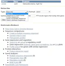 Information of microbial genes stored in MicrobesOnline includes sequences (genes, transcripts and proteins), genomic loci, gene annotations and some statistics of sequences. This information can be accessed through three features displayed on the homepage of MicrobesOnline: sequence search and advanced search in the top navigation section, and the genome selector. For the sequence search tool, MicrobesOnline integrates BLAT, FastHMM and FastBLAST[8] to search protein sequences, and uses MEGABLAST to search nucleotide sequences.[9] It also provides a link to BLAST as an alternative way for searching sequences. On the other hand, the advanced search tool enables a user to search genetic information by categories, custom query, wild-card search and field-specific search, which uses the gene name, the description, the cluster of orthologous groups (COGs) id, the GO term, the KEGG enzyme commission (EC) number, etc. as key words.