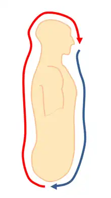 As well as the lower dantian or cauldron there are other important points along the circuit of energy flow which include the 'three gates' which are areas where it is considered that energy may stagnate, these are the wei-lu or Tailbone gate, the Dorsal gate on the back roughly level with the heart, and the Jade pillow on the back of the head.[9] Other important areas include the Ming Men or gate of fire on the back about level with the kidneys and the Baihui or Niwan which is directly on top of the head.[10]