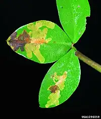 The larvae feed on Chamaecytisus hirsutus, Cytisus scoparius, Cytisus sessilifolius, Genista germanica, Genista sericea, Genista tinctoria, Laburnum anagyroides, Lembotropis nigricans, Lupinus and Petteria ramentacea. They mine the leaves of their host plant. The mine starts as a starlike, lobed blotch on top of the midrib. It develops into an upper-surface blotch that occupies almost the entire leaflet. The colour is light green at first, but soon turns brown. Almost all frass is ejected out of the mine. The larva may leave the mine and start mining elsewhere. Pupation takes place outside of the mine.[2]