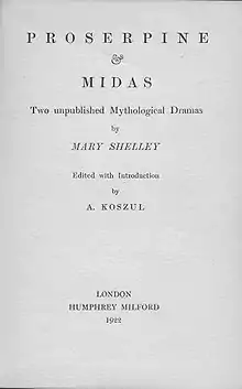 - Shelley, Mary. Proserpine & Midas: Two Unpublished Mythological Dramas by Mary Shelley. Ed. A. Koszul. London: Humphrey Milford, 1922.