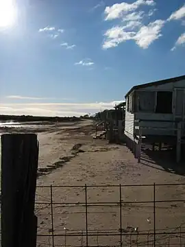 ![]() Looking north along the beachfront shacks | |||||||||||||||