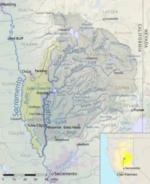 Its headwaters are located near Beckwourth[1] in the largest alpine basin in the Sierra Nevada, the Sierra Valley. The convergence of several streams there creates the Sierra Valley Channels,[6] the largest of which is Little Last Chance Creek, flowing out of Frenchman Lake across the northeast side of the valley. Flowing west, it is joined by Big Grizzly Creek, with waters from Lake Davis. The river continues west, passing Portola and turning northwest at Clio,[6] where it is joined by Sulphur Creek. In the area of Graeagle, It is joined by Frazier Creek, flowing out of Gold Lake, then Gray Eagle Creek, flowing out of Long Lake. After flowing through the Mohawk Valley, it then turns westwards into a canyon. Jamison Creek and Nelson Creek enter from the left, then Onion Valley Creek a few miles onward.[6] Bear Creek, Willow Creek and the North Fork Middle Fork Feather River all come in from the right as the river courses west-southwest through a tight, steep canyon strewn with rapids.[6] It is then joined by the South Branch Middle Fork Feather River from the left.[6] As the river widens into an arm of Lake Oroville, a reservoir formed by the Oroville Dam, the Fall River joins from the left.[6] The reservoir is fed by the North, Middle, West and South Forks of the Feather River, which once joined in the valley to form the main Feather River. That river continues southwards to join the Sacramento River near the unincorporated community of Plumas Landing.[6]