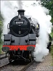 | No. 80080 | BR 2-6-4T Class 4MT | 80080 worked on the old London, Tilbury and Southend Railway branches. On withdrawal, it was sent to Barry in the 60s. 80080 was, with 80098 also at Butterley, first sent to the Peak Rail and they were moved to their current location in 1983. They were soon restored to work on mainline railtours.[20] | On loan to the Ecclesbourne Valley Railway[21] | BR Lined Black with Early Crest. | Princess Royal Class Locomotive Trust. | 1954 | ![]() |
