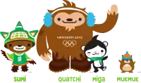 ![]() From left to right, Sumi, the mascot of the Paralympics, Quatchi and Miga, the mascots of the Olympics, and Mukmuk, the "sidekick" for both games | |
