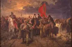 In the eyes of the clergy, Migration of the Serbs would help legitimize Serb claims to religious autonomy and partial self-administration in Austria-Hungary.[9] The official Church narrative held that Leopold had requested that the Serbs of Kosovo, Macedonia and the Sandžak settle along the Ottoman–Habsburg frontier to create a buffer against further Ottoman encroachment, and Church officials intended for Jovanović's painting to reflect this view.[14] Hence, the painting had significant political implications.[15] Habsburg Serbs asserted that the agreement between Arsenije and Leopold legitimized their claim to the lands they inhabited. Croatian nationalists decried the Serbs as "uninvited guests" who only acquired Leopold's pledge of autonomy after they had migrated to the Habsburg lands.[16] Migration of the Serbs was thus intended to challenge the historical and political narratives being forwarded by the Croatian and Hungarian painters whose works were also going to be displayed.[17]