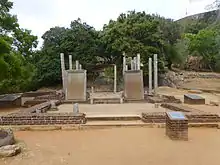 On either side of the entrance to a building, are 2 inscriptions engraved on 2 large slabs of granite known as the Mihintale stone inscriptions. The rules and regulations pertaining to the administrative purposes of the monastery are engraved on these 2 stone slabs. This inscription installed by King Mihindu (956 - 976 AD) contains records of payments made to the service staff. In the vicinity of another plain is the meeting hall of the monks. Here the monks met, to discuss the Dhamma and the Vinaya. This is an open building which is 62 feet (19 m) square and was constructed on 48 stone pillars. In the middle of the hall is a platform with 4 entrances.