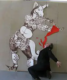 His installation work often involves arrangements of several standing cardboard figures. The first of these was Standing Army, an installation of 50 life-size soldiers made of found cardboard. The figures were based on those found in army recruiting materials, and were arranged in formations based on the Chinese Terracotta Army.