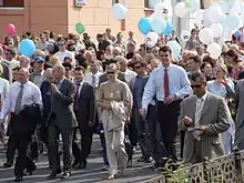 In May 2011, Prokhorov announced a plan to join the leadership of the Russian pro-business political party Right Cause.[29] While not antagonistic to the Kremlin, the party was seen as likely to support President Dmitry Medvedev rather than Prime Minister Vladimir Putin if the latter entered the 2012 presidential race. In June of that year, Prokhorov was elected to the leadership of the party at the Right Cause Party Congress of 2011. At the acceptance ceremony, Prokhorov officially criticized the present ruling tandem of Medvedev-Putin, the structure of Russia, and vowed to bring Russia back to a stable development course.[49] However, in September 2011, Prokhorov reversed course and resigned from Right Cause, "condemning it as a 'puppet Kremlin party' micromanaged by a 'puppet master' in the president's office ... Vladislav Y. Surkov".[50]