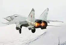 As an interceptor, typical armament includes four R-40 long-range air-to-air missiles, each fitted with either an infrared seeker (R-40T/TD) or a semi-active radar homing seeker (R-40R/RD) and a maximum range of 35–60 km (22–37 mi) against a high-flying target on a collision course. A fuel tank could be suspended under the fuselage. The aircraft could carry unguided gravity bombs to fulfill a rudimentary strike role by using a delivery system developed for nuclear weapons.[23] As the bombs would weigh no more and incur no more drag than its regular load of R-40 missiles, its performance was not impaired, leading to some impressive bombing feats; when released at an altitude of 20,000 m (66,000 ft) and a speed above Mach 2, a 500 kg (1,100 lb) bomb would have a range of several tens of kilometres.[24]