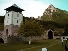 The Mileševa Monastery (Serbian Cyrillic: Манастир Милешева, romanized: Manastir Mileševa, pronounced [mîlɛʃɛʋa] or [milɛ̌ʃɛʋa]) is a Serbian Orthodox monastery located near Prijepolje, in southwest Serbia. It was founded by King Stefan Vladislav I,[1] in the years between 1234 and 1236. The church has frescoes by the most skillful artists of that time, including one of the most famous in Serbian culture, the "White Angel", which depicts an angel at Christ's tomb. Mileševa is considered to contain one of the most beautiful works of European arts from Middle ages.