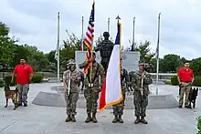 The Military Working Dog Teams National Monument consists of five bronze sculptures (four dogs and dog handler) seated on a large granite pedestal inscribed, "Guardians of America's Freedom."[1] The center sculpture is a highly detailed 9-foot modern day Military Working Dog Handler wearing combat gear and holding a dog leash in his left hand and a M4 rifle in his right hand.