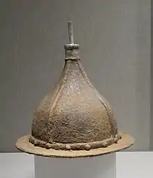 Another specimen, the Wuwei Bronze Cannon, was discovered in 1980 and may possibly be the oldest as well as largest cannon of the 13th century: a 100 centimeter 108 kilogram bronze cannon discovered in a cellar in Wuwei, Gansu Province containing no inscription, but has been dated by historians to the late Western Xia period between 1214 and 1227. The gun contained an iron ball about nine centimeters in diameter, which is smaller than the muzzle diameter at twelve centimeters, and 0.1 kilograms of gunpowder in it when discovered, meaning that the projectile might have been another co-viative.[45] Ben Sinvany and Dang Shoushan believe that the ball used to be much larger prior to its highly corroded state at the time of discovery.[46] While large in size, the weapon is noticeably more primitive than later Yuan dynasty guns, and is unevenly cast. A similar weapon was discovered not far from the discovery site in 1997, but much smaller in size at only 1.5 kg.[47] Chen Bingying disputes this however, and argues there were no guns before 1259, while Dang Shoushan believes the Western Xia guns point to the appearance of guns by 1220, and Stephen Haw goes even further by stating that guns were developed as early as 1200.[44] Sinologist Joseph Needham and renaissance siege expert Thomas Arnold provide a more conservative estimate of around 1280 for the appearance of the "true" cannon.[48][49] Whether or not any of these are correct, it seems likely that the gun was born sometime during the 13th century.[47]