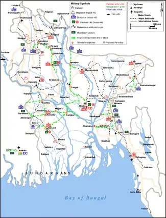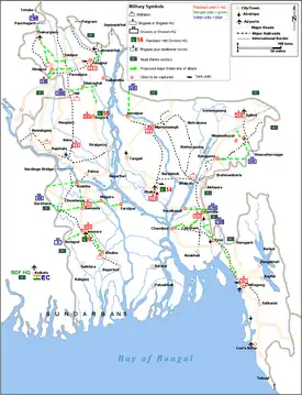 The DMO had assumed that India did not have adequate forces to liberate Dhaka within the allotted time span, so the objective was to liberate the maximum amount of territory.[59] Since this plan did not assumed India attacking with a 3:1 advantage in numbers against the assumed 4 Pakistani infantry divisions in Bangladesh, Gen. K.K Singh envisioned the Mukti Bahini helping to fill the gap in strength as follows: