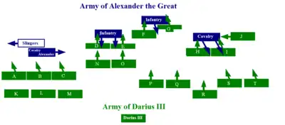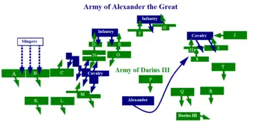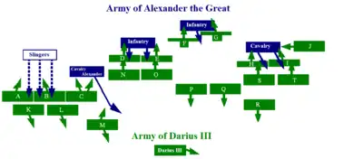 Alexander the Great had an army of 47,000 men, which was small compared to those of Darius—who according to modern historians assembled between 50,000 and 120,000 soldiers, maximum figure due to supply problems. The "hammer" and "anvil" tactics, which were the key to Alexander's victories until then, could no longer lead to victory, for it was indeed impossible to surround the entire Persian army.
