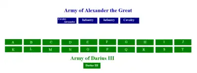 The military tactics of Alexander the Great (356 BC - 323 BC) show that he was one of the greatest generals in history. During the Battle of Chaeronea (338 BC), won against the Athenian and Theban armies, and the battles of Granicius (334 BC) and of Issus (333 BC), won against the Achaemenid Persian army of Darius III, Alexander employed the so-called "hammer and anvil" tactic. However, in the Battle of Gaugamela (331 BC), the Persians possessed an army vastly superior in numbers to the Macedonian army. This tactic of encirclement by rapid shock units was not very feasible. Alexander had to compose and decide on an innovative combat formation for the time; he arranged his units in levels; he pretended to want to encircle the enemy in order to better divide it and thus opened a breach in its defensive lines.