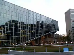Started in 2003[15] and completed in 2005, the $21-million[16] redevelopment of the Centennial Library involved the addition of 3,700 square metres (40,000 sq ft) of new space, construction of a new fourth floor, and renovations throughout the existing 10,000-square-metre (110,000 sq ft) library.[2] The library now features a new Reading Terrace with a four-storey high solar glass wall, positioned alongside a new grand staircase, along with two new glass elevators,[2] and a passive solar wall on the southeast face of the building.[15]