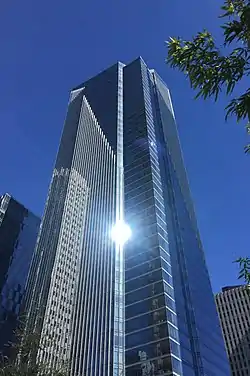 The residences are expensive; a penthouse unit sold for $13 million in December 2016.[19][20] The bottom 25 floors of the main tower are marketed as Residences while the floors from 26 to the top are marketed as Grand Residences. As happens with many high-rises, there is no thirteenth floor because of superstitions related to triskaidekaphobia. Neither is there a forty-fourth floor, because the number four is considered unlucky by many Asians.[21] The 53 units in the separate 12-story tower are marketed as City Residences.[1] Below street level, there are 434 parking spaces in a five-level subterranean garage located under the 11-story tower.[15] The building is located next to the site of the Transbay Transit Center. The tower's design was marketed as resembling a translucent crystal, and was, until accompanied by much larger adjacent buildings, a landmark for the Transbay Redevelopment and the southern skyline of San Francisco.[18]