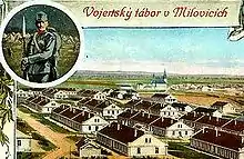 The first military base was founded in Mladá by the Austro-Hungarian Army in 1904.[2] During World War I, there was a prisoner camp of Russian and Italian soldiers, which has a military cemetery in town. After the War, the newly founded Czechoslovak Army started to use the camp as a main military base in Bohemia. During the German occupation of Czechoslovakia, the base served as a centre for German film propaganda, where fake footage from the Eastern Front was shot.