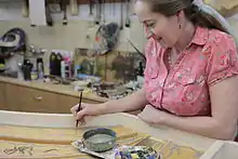 She uses her own developed unique method for decorating the harpsichord body and its legs called marbling.