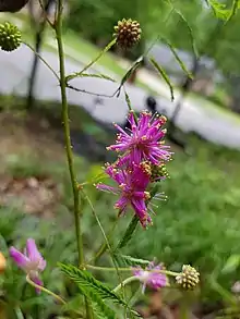 It is a sprawling, herbaceous plant with alternate leaves. Each leaf is compound with up to 16 pairs of leaflets that fold together when touched. The stem is covered with small recurved prickles. The flowerheads comprise round clusters of numerous pink flowers, each flower only 3 mm (0.12 in) long with exserted stamens. The fruits are also prickly. Flowering occurs from May through September.[4]