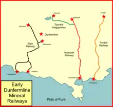 Several mineral railways were constructed around Dunfermline in western Fife, Scotland, in the eighteenth century and later. Their purpose was to convey minerals to market from the outcropping coal deposits that had encouraged industrial activity in the area from an early date.
