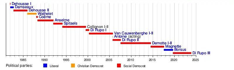 — | 25 October 1982 | 11 December 1985 | 3 years, 46 days | Socialist Party (PS) | Dehousse II | PS–PRL–PSC | |